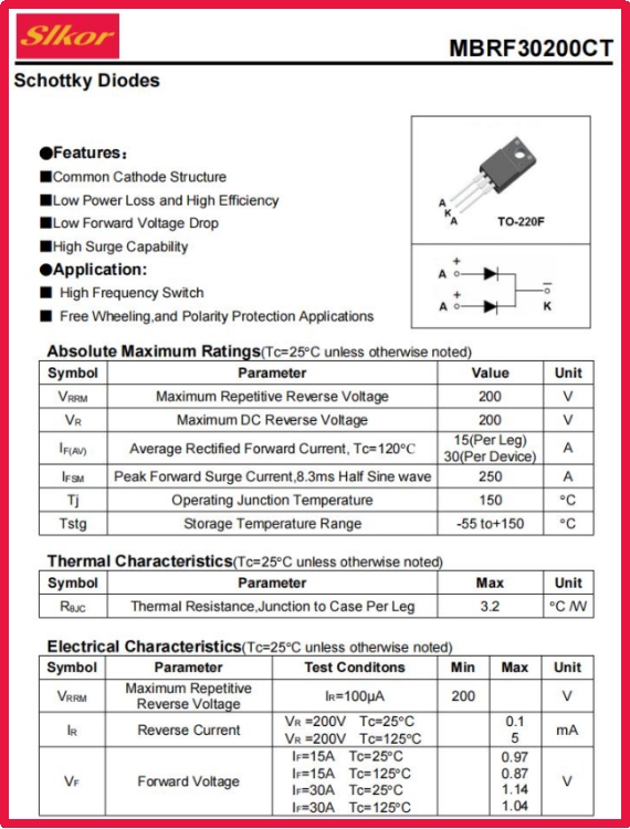 在5G基站晝夜不息的嗡鳴聲中,在新能源汽車電機精準的轉速控制里,在光伏板將陽光轉化為電流的瞬間,一場關于電力電子器件的效率革命正在悄然發生。薩科微Slkor推出的MBRF30200CT肖特基二極管,以“高頻低損”與“熱控藝術”的雙重突破,重新定義了功率器件的性能邊界。