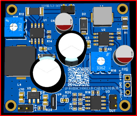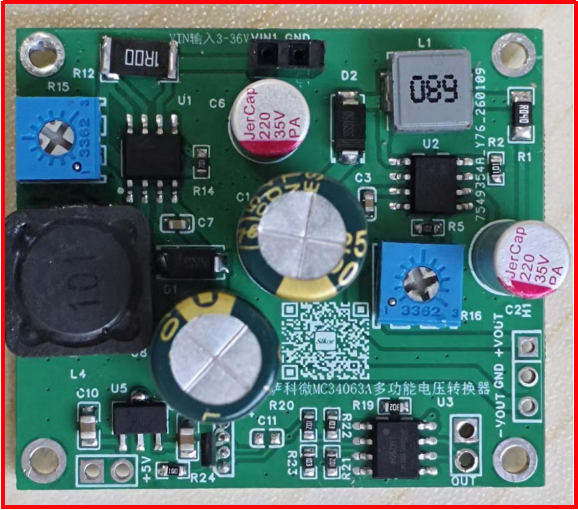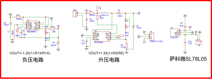 4.2圖二為薩科MC34063A微升降壓調節器。在輸入端接5V供電,調節電位器R15和R16能得到正負電壓,比如+-9V,+-12V來給運放放大器LM2904提供正負電壓源供電。MC34063A很方便就能實現一個負壓調節器。同時MC34063A是一款單片開關穩壓器控制電路,包含直流-直流轉換器所需的主要功能。該器件由內部溫度補償基準源、電壓比較器、帶有源電流限制電路的可控占空比振蕩器、驅動器和大電流輸出開關組成。