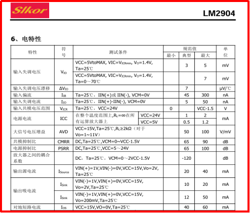 強度的關系曲線圖。從圖中可以看到磁場強度和輸出電壓呈線性關系。非常適合薩科微LM2904這類運放去采集它的一個輸出信號。LM2904輸入失調電壓3-5Mv,電源電壓范圍寬:單電源(3V~20V);雙電源 (±1.5V~±10V)用雙電源供電方式能更精準的進行信號采集。參數如下圖