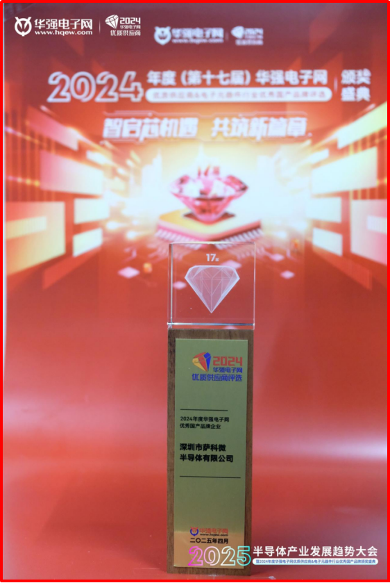 2025年4月,在“2025半導體產業發展趨勢大會暨2024年度(第十七屆)華強電子網優質供應商&電子元器件行業優秀國產品牌頒獎盛典”上,薩科微半導體再獲由華強電子網頒發的“2024年度華強電子網優秀國產品牌企業”。這是公司連續第三年獲此殊榮,充分彰顯了薩科微Slkor品牌在國產半導體領域的影響力。