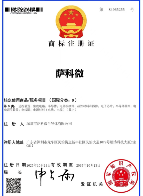 2025年12月,薩科微中文商標正式通過國家知識產權局核準并生效。此次注冊進一步明確了“薩科微”品牌的法律保護范圍,為公司市場推廣與品牌建設提供了規范化的法律依據,也是我們品牌保護體系進一步的完善。這每一步都見證了薩科微的穩健發展!