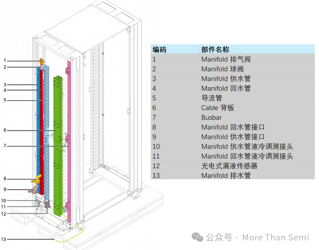 對于服務器機架中液冷的拆解,查了很久沒有查到NVL72的很好的圖,下面這個圖是參考的ZOMI大神的一個圖,這個是華為的服務器的拆解,但機架其實差不太多,也可以供大家參考,了解在Rack層面,哪些是跟液冷相關的。